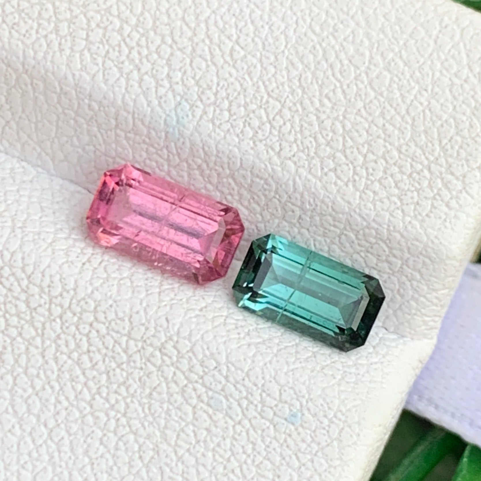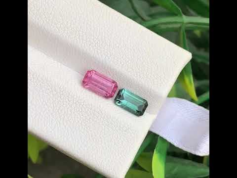This exceptional 1.75-carats pair of tourmalines features a unique emerald cut with a rare reverse arrangement, highlighting their distinctive color play and clarity. Ideal for sophisticated jewelry designs, these unmatched stones offer expert-grade brilliance and versatility, enhancing any bespoke creation with a subtle yet striking elegance.