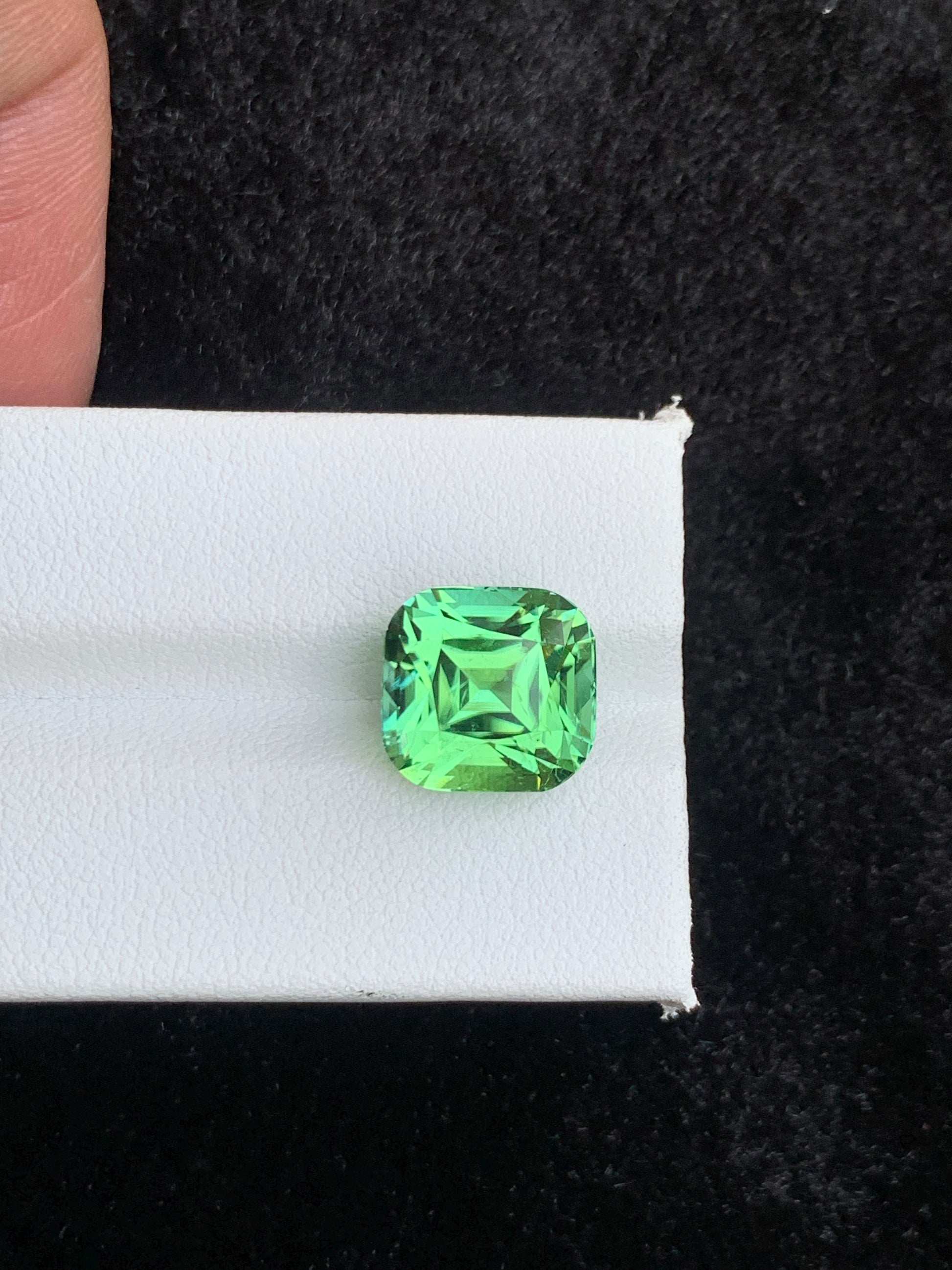This exceptional 9.10 Carats Afghan tourmaline showcases a vibrant apple green hue that exemplifies the finest qualities of this renowned gemstone source. The cushion cut maximizes color saturation while providing excellent light performance, making it an ideal choice for bespoke jewelry designs. Afghan tourmalines are prized by collectors and connoisseurs for their superior clarity and distinctive green tones.