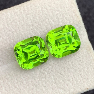 This pair of natural green Peridot gemstones, totaling 10.60 Carats, features a refined cushion cut that enhances their vibrant green hue. Ideal for crafting elegant earrings, these peridots offer excellent clarity and brilliance, making them a sophisticated choice for fine jewelry designs. Their balanced size and classic cut ensure they complement a variety of styles with expert precision.