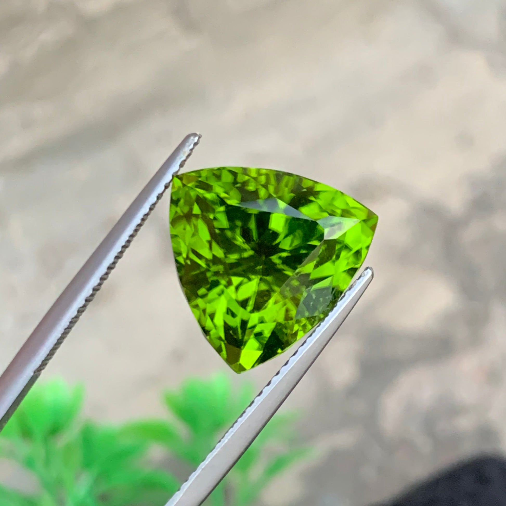 This 11.00 carats peridot gemstone features a brilliant triangular cut that highlights its luminous green hue. Known for its vibrant color and clarity, this gemstone offers both elegance and a unique shape ideal for custom jewelry pieces. Perfect for collectors and designers seeking a striking, expert-level gem with excellent visual appeal.