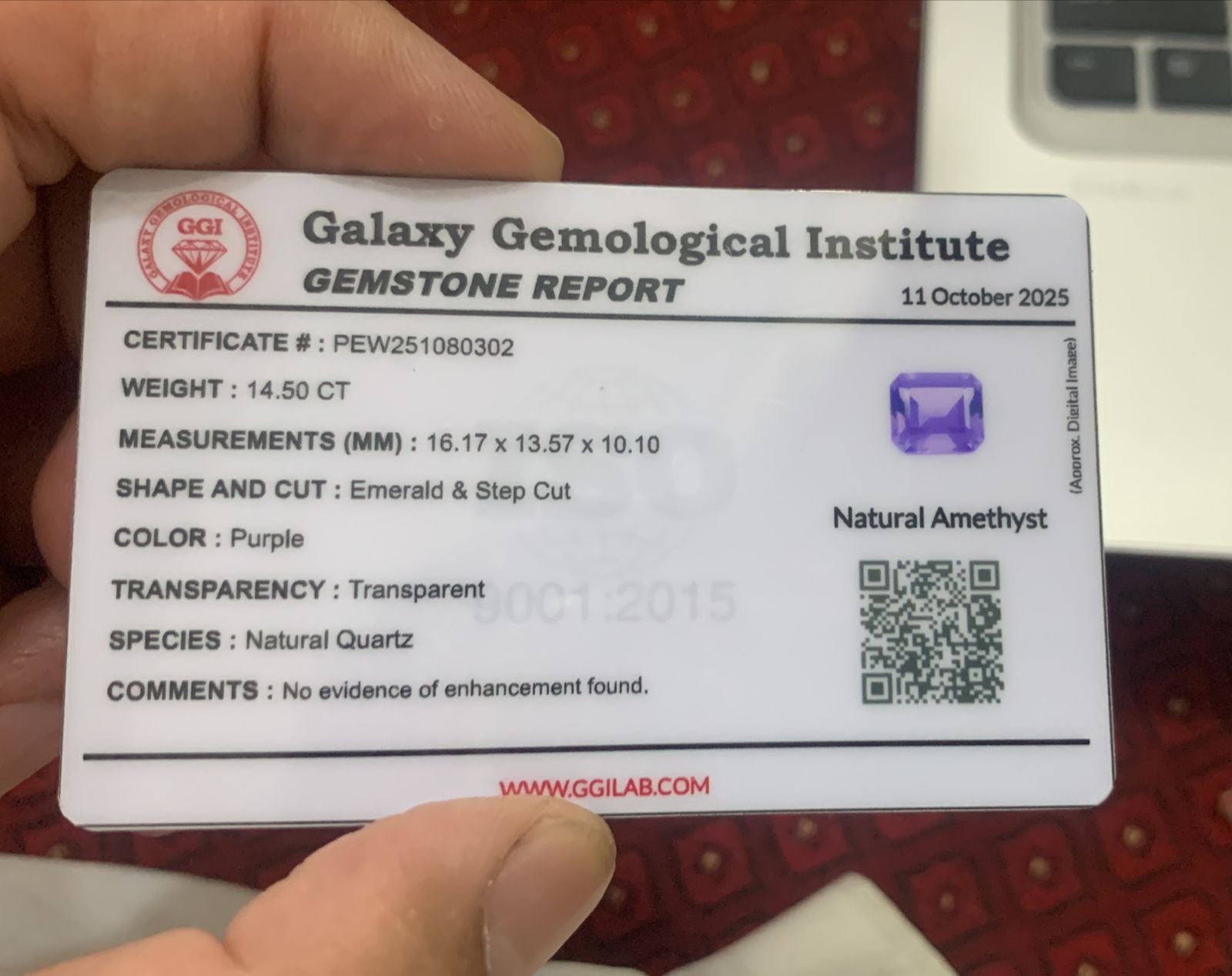This remarkable 14.50 carat amethyst features a expertly faceted emerald cut, enhancing its vibrant pink-purple hues. Originating from Brazil, this gemstone offers excellent clarity and depth of color, complemented by certification to verify authenticity. Ideal for sophisticated jewelry pieces, it appeals to collectors and designers who value both beauty and provenance in their gemstones.