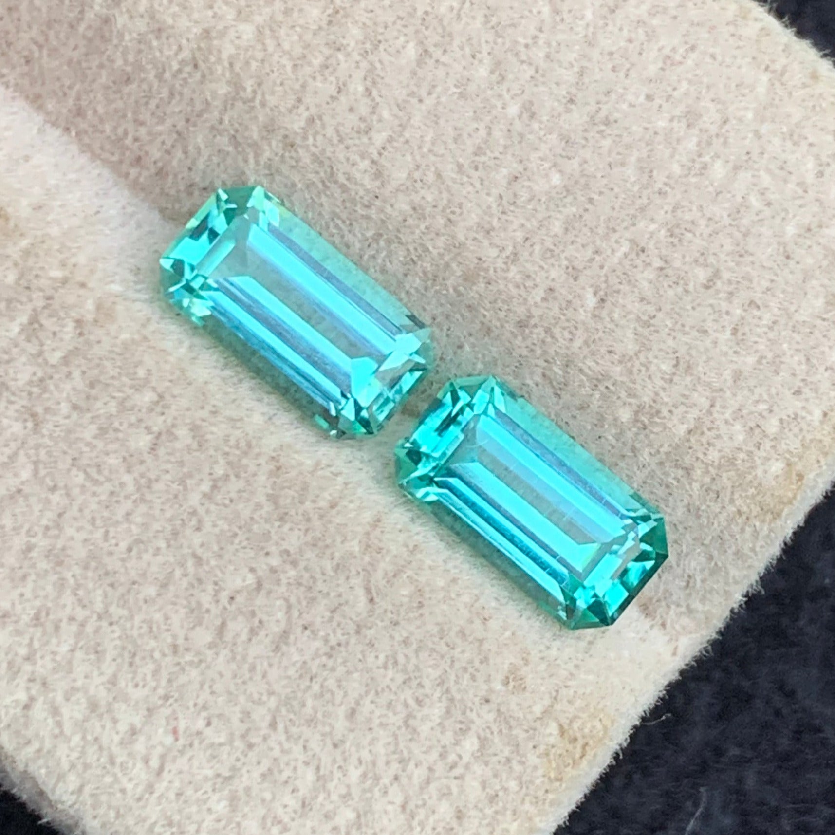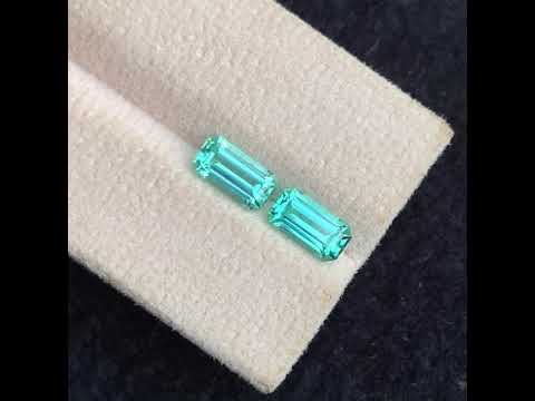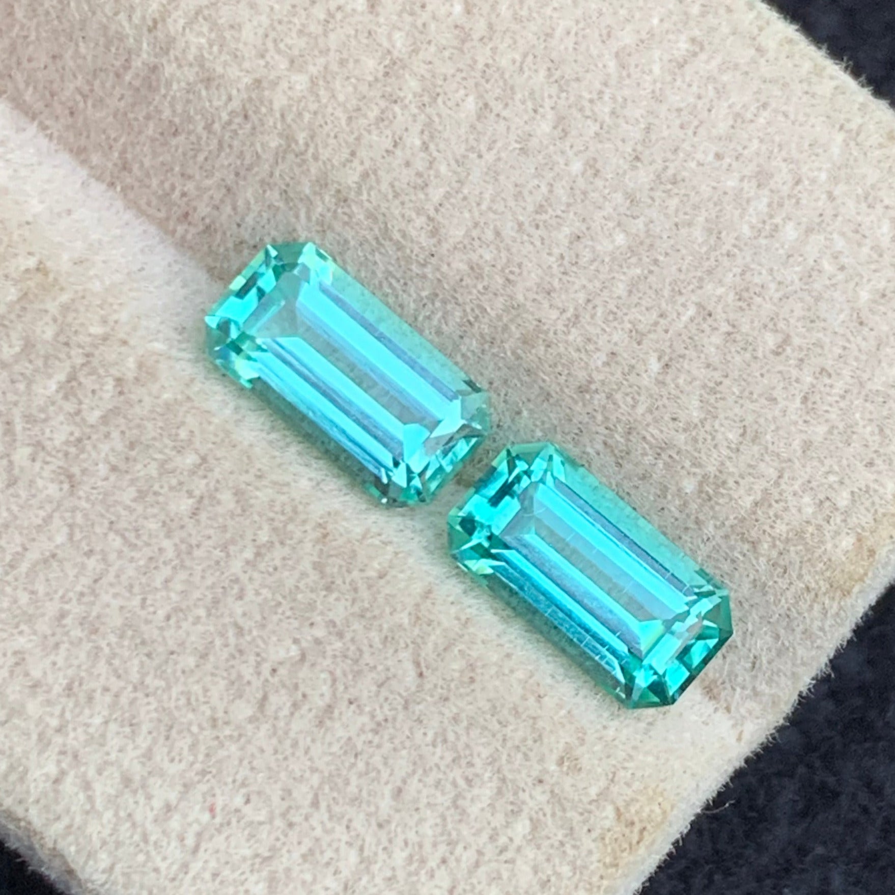 This exquisite 2.05-carats matched tourmaline pair showcases a refreshing greenish seafoam hue, reminiscent of tranquil tropical waters. Expertly crafted in a classic emerald cut, each stone offers crisp facets and exceptional clarity, allowing light to glide beautifully across their surfaces. Perfectly paired in size and color, they are ideal for elegant, symmetrical jewelry designs.