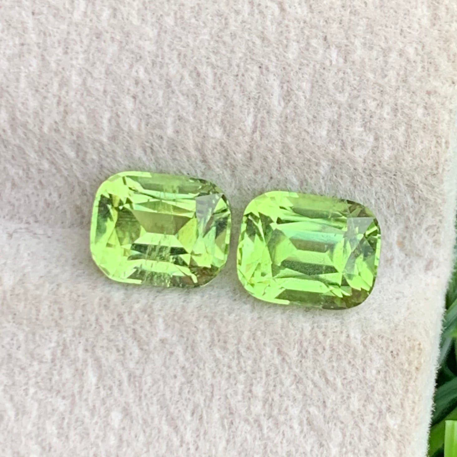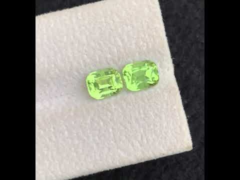 This 2.55 Carats pair of greenish-yellow peridot gemstones features a refined cushion cut, ideal for crafting elegant earrings. Their vibrant hue and precise cut enhance brilliance and color depth, making them a sophisticated choice for fine jewelry designs. Perfect for those seeking a distinctive yet classic gemstone with expert appeal.