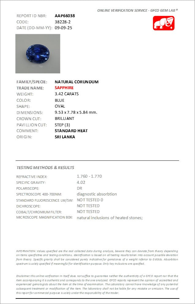 This exquisite 3.42 Carats blue sapphire showcases the renowned deep, velvety blue hue characteristic of Sri Lankan gemstones. Cut in a graceful oval shape, it presents excellent light dispersion and visual appeal. The stone comes accompanied by a certificate of authenticity, verifying its origin, weight, and quality specifications. Ideal for bespoke jewelry commissions, investment collections, or statement pieces, this sapphire combines rarity with timeless elegance.