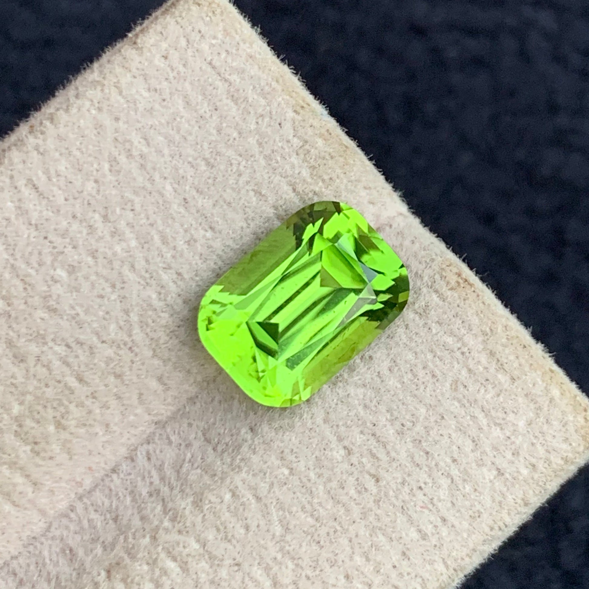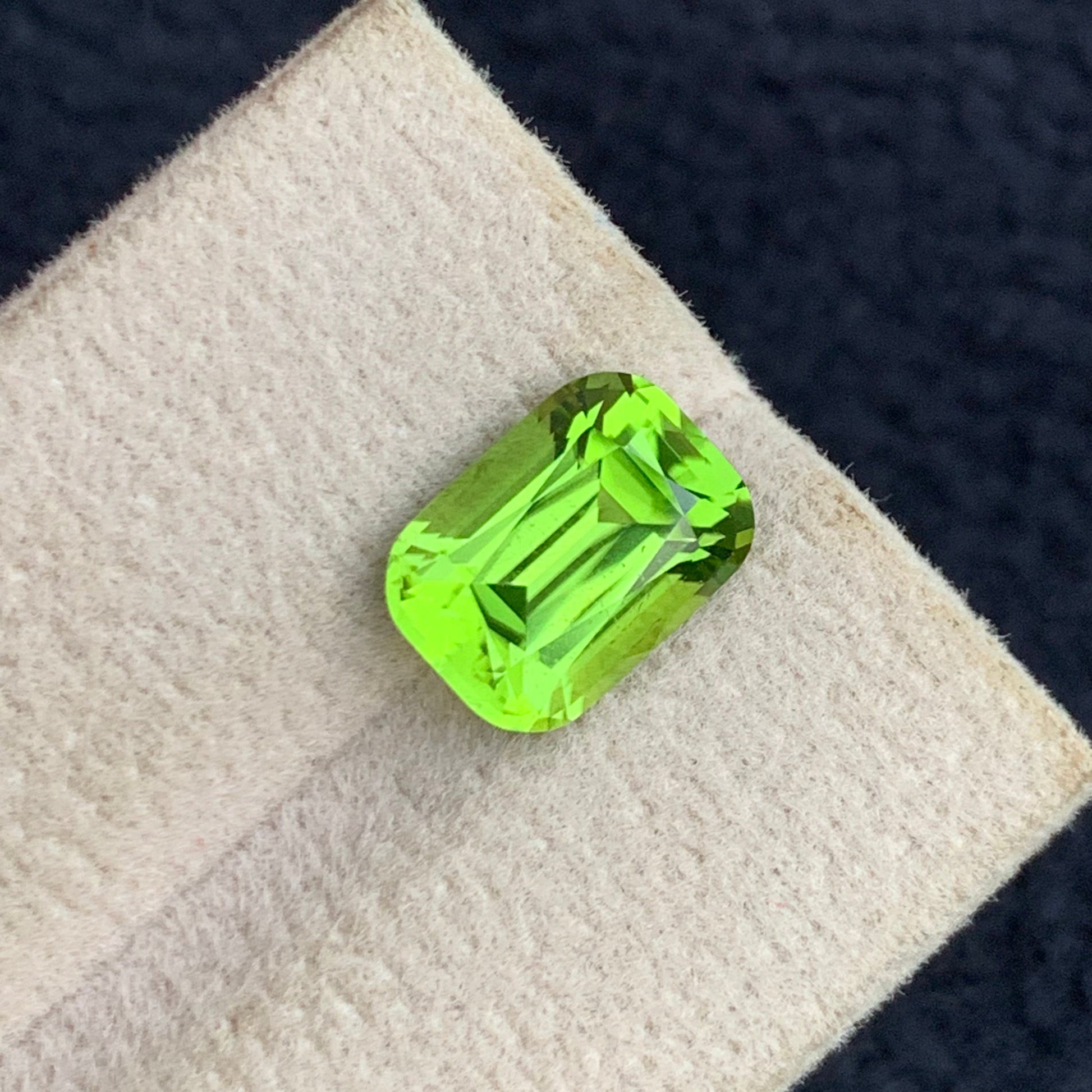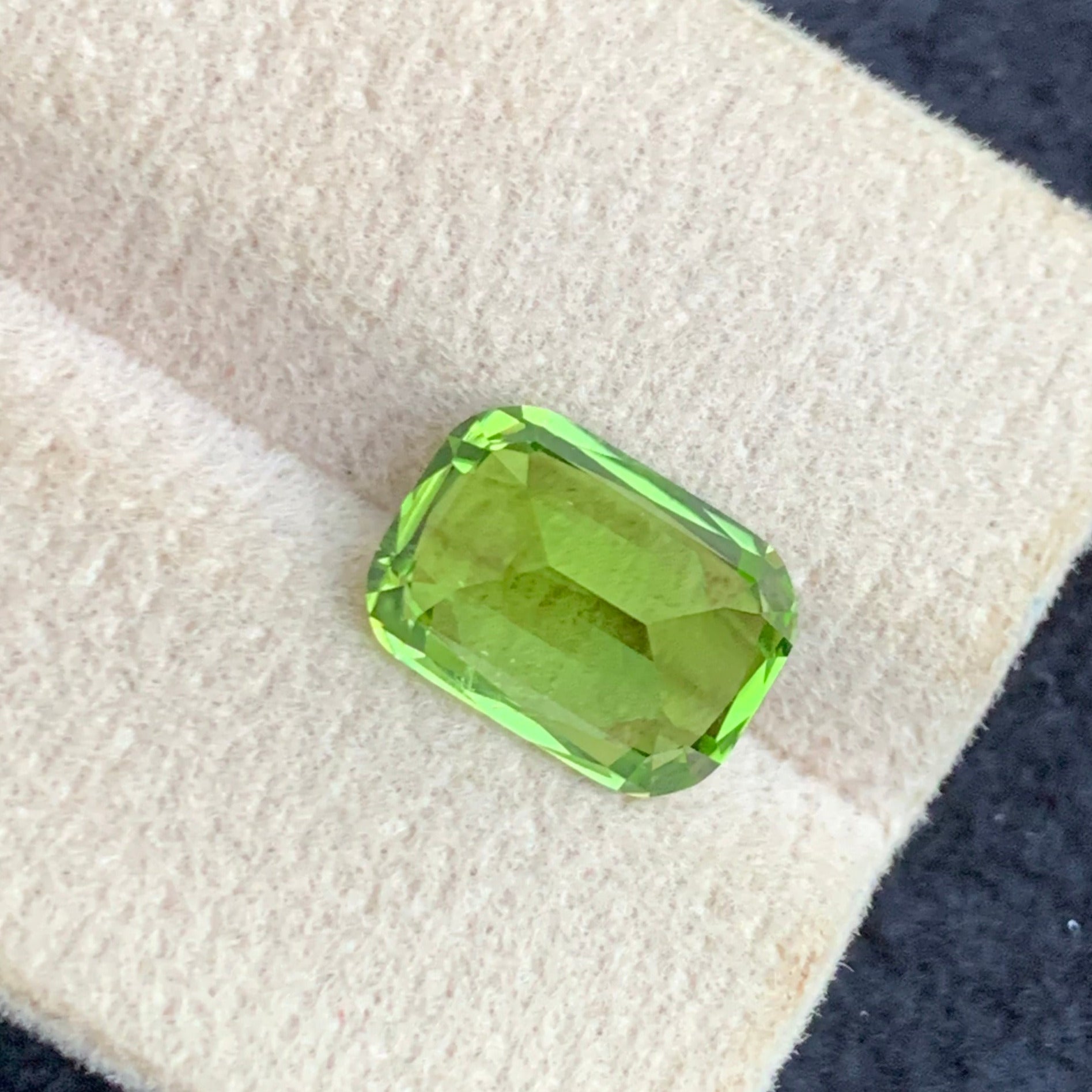 This 3.75-carat natural green Peridot gemstone features a classic cushion cut, enhancing its brilliant sparkle and vibrant green hue. Renowned for its clarity and unique color, this gemstone is ideal for creating sophisticated, eye-catching jewelry. Its expertly crafted cut maximizes light reflection, providing exceptional brilliance and depth for discerning gem enthusiasts.