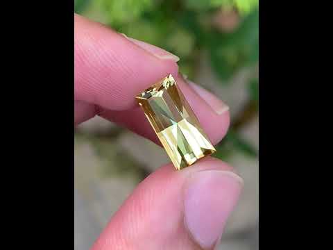This 4.18 carats greenish-yellow tourmaline features an elegant fancy baguette cut, enhancing its natural brilliance and unique color. Ideal for sophisticated jewelry designs, its precise cut maximizes light reflection, highlighting the gem's vibrant hue and clarity. Perfect for collectors and connoisseurs seeking a distinctive and high-quality gemstone.