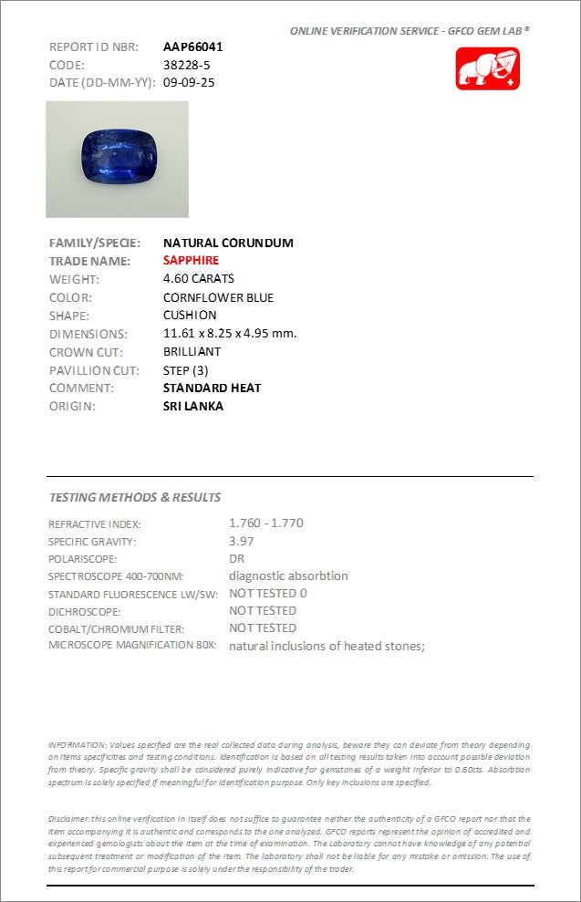 Discover this exceptional 4.60 Carats blue sapphire, sourced directly from Sri Lanka's renowned gemstone regions. Cut in a sophisticated cushion shape, this stone showcases the deep, velvety blue hues that Sri Lankan sapphires are celebrated for. Each facet is precisely angled to maximize brilliance and color saturation, creating a captivating display of light and depth. Accompanied by an authentic gemstone certificate, this sapphire offers verified quality and authenticity.