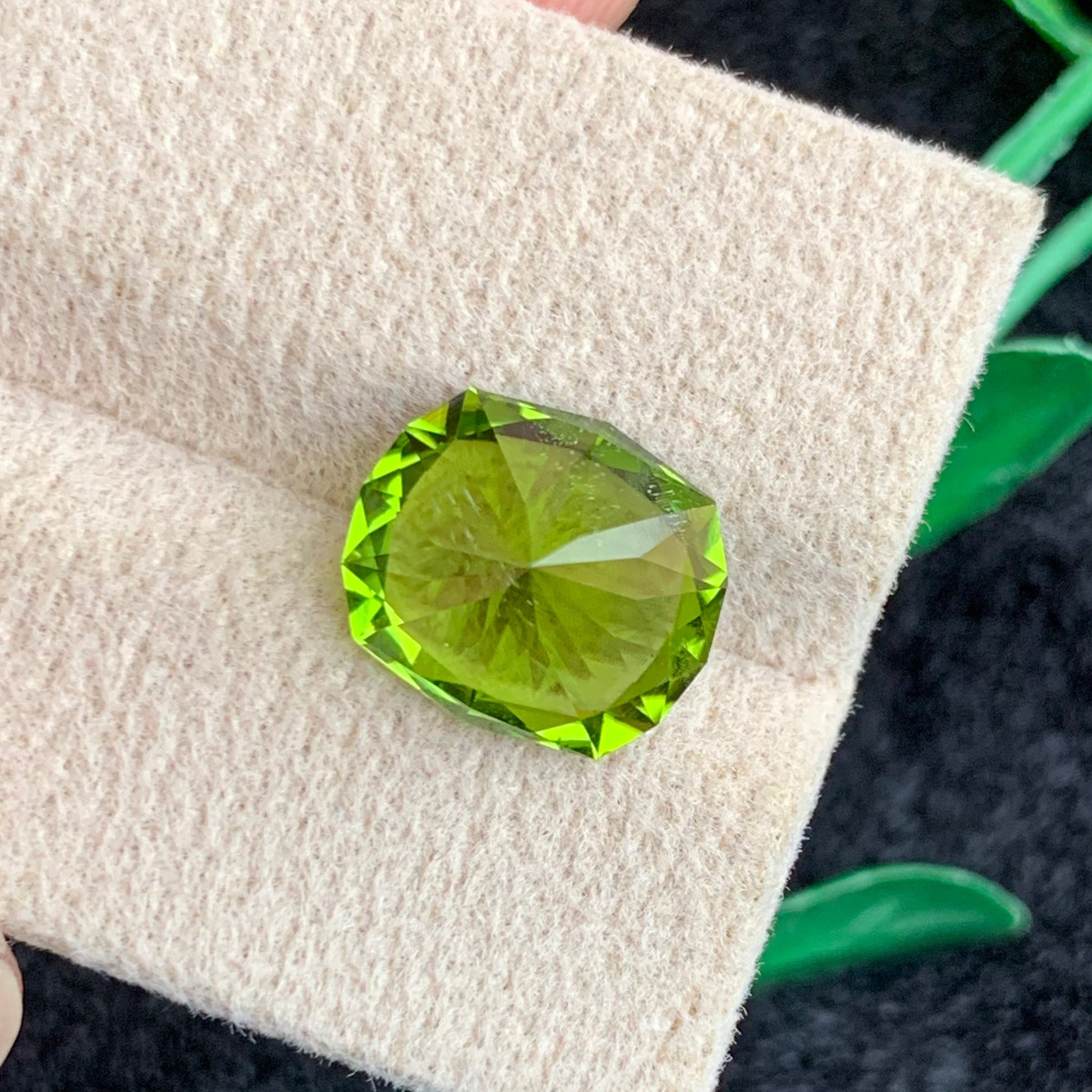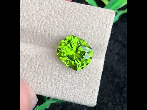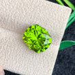 The gemstone displays a rich, vibrant green color with slight golden or yellowish undertones, characteristic of high-quality peridot. Its fresh, lively hue remains consistent under different lighting conditions, making it highly desirable among gemstone lovers.