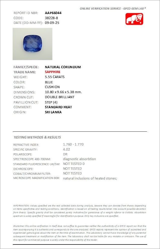 Discover this exceptional 5.55 Carats blue sapphire, sourced directly from Sri Lanka's renowned gemstone regions. Cut in a sophisticated cushion shape, this stone showcases the deep, velvety blue hues that Sri Lankan sapphires are celebrated for. Each facet is precisely angled to maximize brilliance and color saturation, creating a captivating display of light and depth.